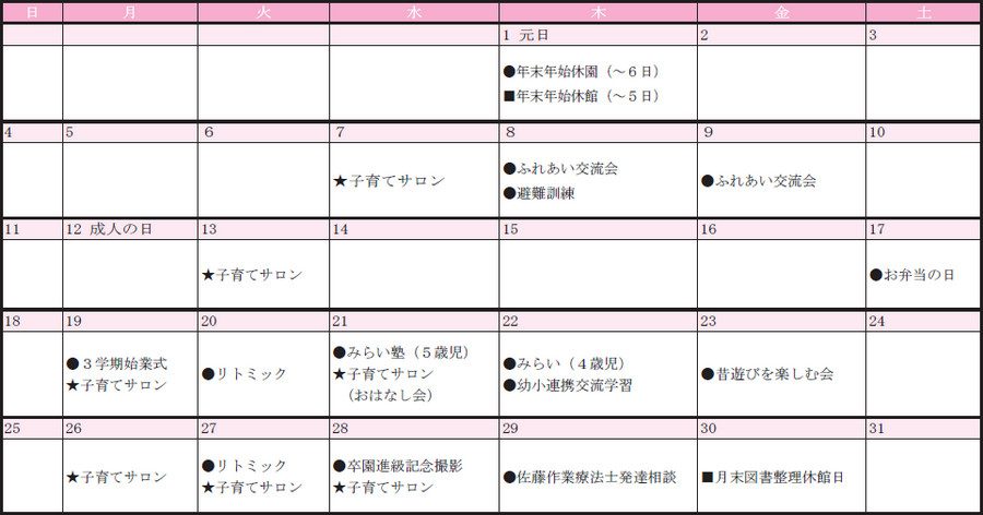 子育て 1 月の幼児センター・子育てサロン・図書館の予定 16/24 前の記事 次の記事 発行日 : 2025年12月26日 自治体名 : 北海道様似町 広報紙名 : 広報さまに 令和8年1月号 1月の ●幼児センター・★子育てサロン・■図書館の予定 ★子育てサロン(幼児センターぱんだ組) ▽おはなし会 1月21日(水)10:30~ 図書館司書さんと絵本を楽しみましょう。 本の貸し出しもあります。 問合せ:子育て支援係 【電話】36-5521 Tweet シェアする 生涯学習 得徳情報 児童クラブひまわり