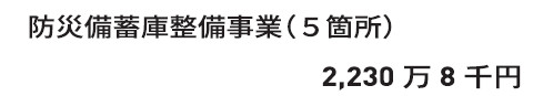 防災備蓄計画に基づき、防災資機材などの備蓄施設を順次整備しており、鵜苫高台・葬斎場・新日本電工裏山・岡田生活館・東平宇高台にそれぞれ整備を行いました。