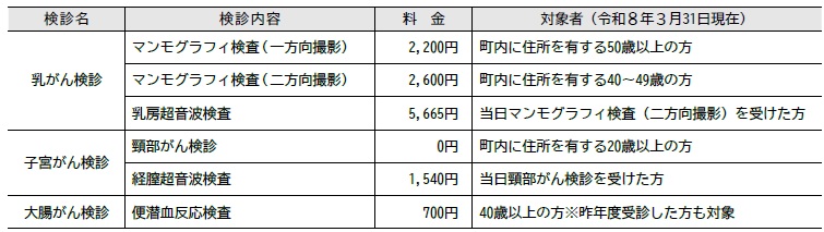 ※乳がん・子宮がん検診は、昨年度町の助成を受けていない方が対象です。