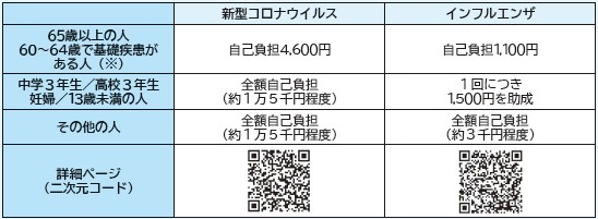 新型コロナワクチンとインフルエンザワクチンの接種が10月から始まります。令和7年度の費用負担については下記のとおりです。医療機関などの詳細は、広報10月号とホームページでお知らせします。