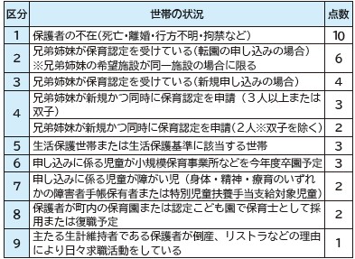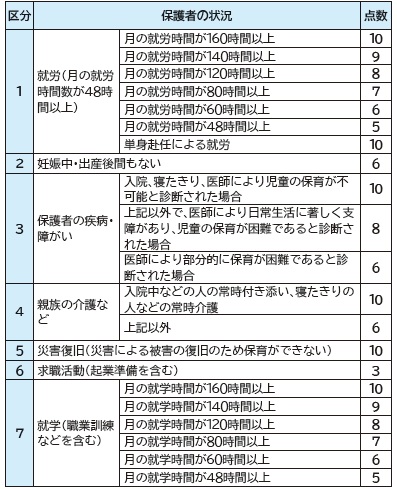 ▽表1 保護者の状況による点数の基準(基準点数)