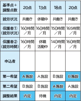 利用調整は、「保育園等利用調整基準」の基準点数および調整点数に基づき、保育の必要性が高い児童から順位を決定します(申し込みの先着順ではありません)。同一順位の応募が複数の場合は、世帯の合計所得の低い順に利用予定者を決定します。