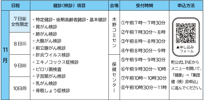 11月の集団健診(検診)の日程は以下のとおりです。受診を希望する人は、10月10日(金)までに健康推進課へ電話または町公式LINEからお申し込みください。