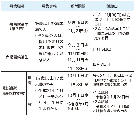 自衛隊帯広募集案内所は、自衛官候補生などを下表のとおり募集します。