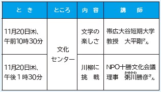 講座 11月のシニア大学(大学院)講座 18/42 前の記事 次の記事 発行日 : 2025年10月24日 自治体名 : 北海道音更町 広報紙名 : 広報おとふけ 令和7年11月号 11月のシニア大学(大学院)の講座は以下のとおりです。興味のある人は、どなたでも参加できます。申し込みや参加料は不要です。一度だけの体験受講も可能で、入学は随時受け付けています。 問合先:教育委員会生涯学習課 【電話】内線776 Tweet シェアする 生涯学習のまど お知らせ~スポーツ