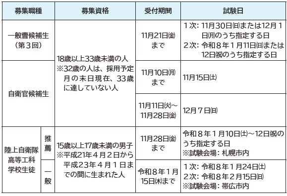 自衛隊帯広募集案内所は、自衛官候補生などを下表のとおり募集します。