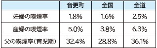 令和5年度の音更町の妊婦の喫煙率は1.8%、産婦は5.0%となっており、それぞれ全国平均を上回っています。また、産婦の喫煙率は妊娠期と比べて高くなっています。さらに、育児期の父の喫煙率も32.4%と全国平均を上回っています。