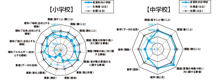 ※教科の領域別に全国を100とした場合の全道および市町村の状況をレーダーチャートで示したもの(市町村の平均正答率÷全国(公立)の平均正答率×100で算出)。