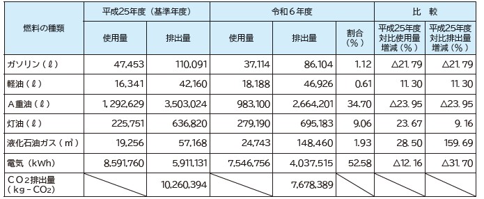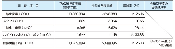 取り組み結果の概要:令和6年度の温室効果ガス総排出量は7,688,196kgで、基準年度の平成25年度と比較して、25.13%(2,580,898kg)の削減となりました。温室効果ガス総排出量のおよそ99.87%が二酸化炭素で、燃料別使用量では、軽油・灯油・液化石油ガスで増加しましたが、ガソリン・A重油・電気は減少となりました。