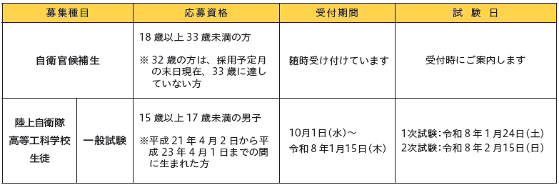 ※募集資格の年齢は採用時期によって異なります。なお受付期間や試験日については状況により変更になることがあります。詳しくはお問い合わせください。