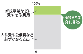 入ってくるお金のうち、毎年度必ず支出しなければいけないお金(=経常的支出)の割合を示したものです。大きい方がその割合が高く、財政の融通が効きにくいです。