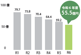 令和6年度には、新たに約5.6億円借り入れましたが、将来の財政負担を考慮し、交付税算入がある有利な町債の借り入れを行い、町債残高は約55億円となっています。そのうち約41億円については地方交付税で措置されるので、町が実際に支払う額(借入額)は約14億円となります。