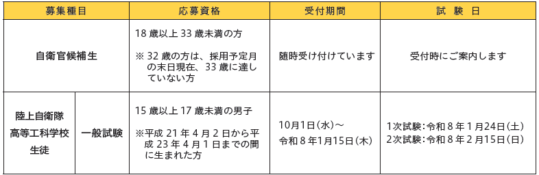 ※募集資格の年齢は採用時期によって異なります。なお受付期間や試験日については状況により変更になることがあります。詳しくはお問い合わせください。