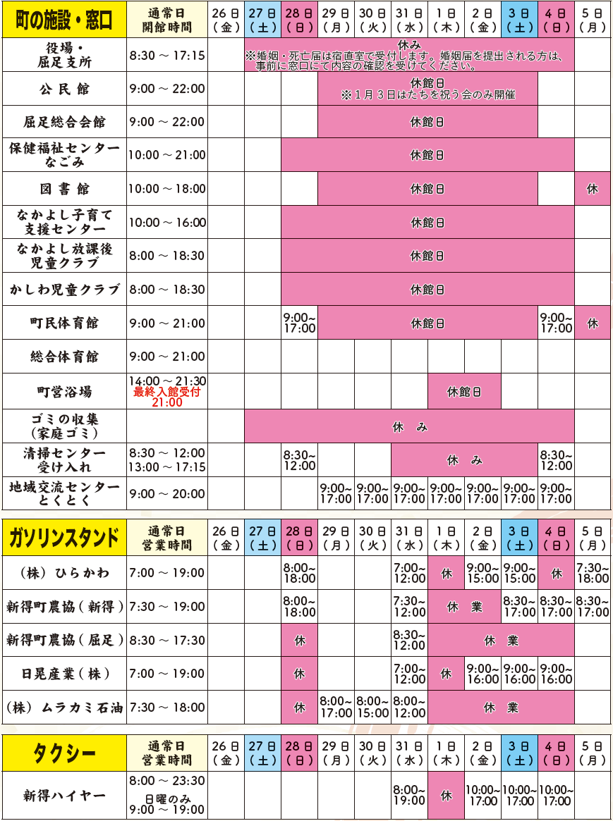 くらし 年末年始の町内施設状況 1/23 次の記事 発行日 : 2026年01月01日 自治体名 : 北海道新得町 広報紙名 : 広報しんとく(令和8年1月号) しっかりチェックして、年末年始をうまくすごそう。 Tweet シェアする 今月の表紙