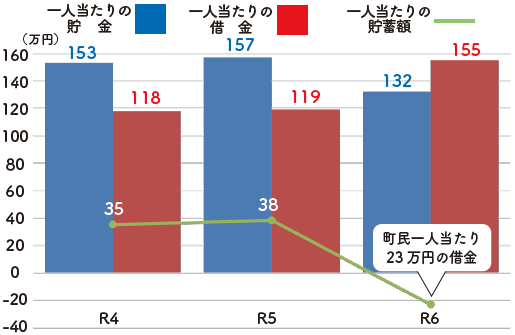 大型事業に伴う借金の増加や貯金の取り崩しにより貯蓄が減少し、町民一人あたりに換算すると、23万円の借金となりました。