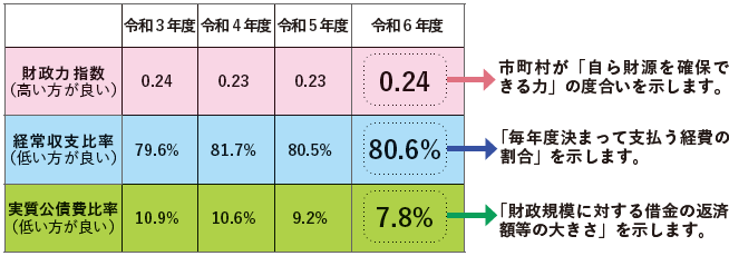 実質公債費比率は前年と比べ下がっており、借金の返済等に充てるお金の割合は健全な水準が維持されています。経常収支比率はわずかに上がりましたが、比較的良好な値を維持しています。