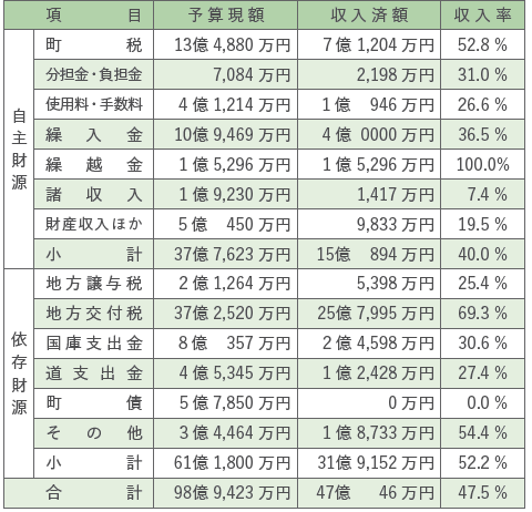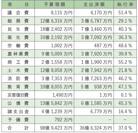 令和7年度当初予算額85億8,900万円に、令和6年度に事業が完了せず令和7年度に繰り越された繰越明許費5,659万円と補正予算額12億4,864万円を反映させた、9月末現在の予算額は98億9,423万円です。予算執行状況は、歳入(収入)が表1、歳出(支出)が表2のとおりです。
