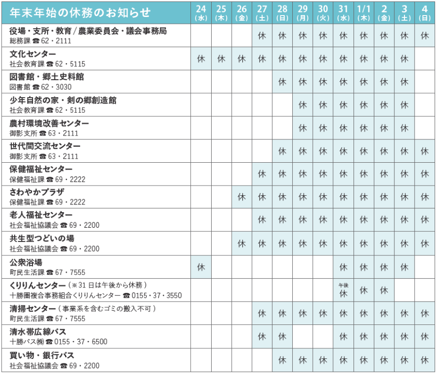 くらし 年末年始の休務のお知らせ 12/15 前の記事 次の記事 発行日 : 2025年12月15日 自治体名 : 北海道清水町 広報紙名 : 広報Shimizu 2025年12月号 ※休務期間中の死亡届などの届出は、日直警備員にお伝えください。各施設については、当該施設までご連絡ください。 Tweet シェアする 火の用心 第137号 みらつぐ