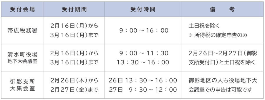 帯広税務署で申告する人は、事前にホームページや電話などで申告方法をご確認ください。