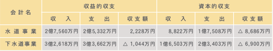 企業会計は、水道・下水道の使用料で運営している会計です。日々の営業活動に必要な経費の「収益的収支」と、上下水道施設の整備・改修などに必要な経費の「資本的収支」に分けて経理しています。