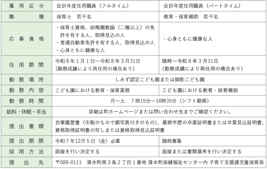 なお、現在施設を利用中で次年度も継続して利用を希望される場合も改めて申込みが必要です。必要書類は町ホームページのほか、各こども園、学童クラブ、子育て支援課で配布しています。