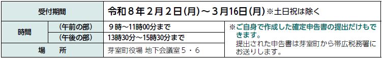 なお、芽室町役場で申告受付をできない所得等があります。詳しくは広報すまいる1月号か芽室町ホームページをご覧ください。