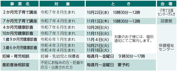 第1・3・5金曜日は助産師、第2金曜日は管理栄養士、第4金曜日は保健師が来て相談に応じます。