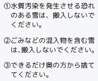 道路や歩道への雪出しは、道路法や道路交通法の禁止行為となっています。道路が凸凹になり交通事故や交通障害の原因となり危険ですので雪出しはやめましょう。