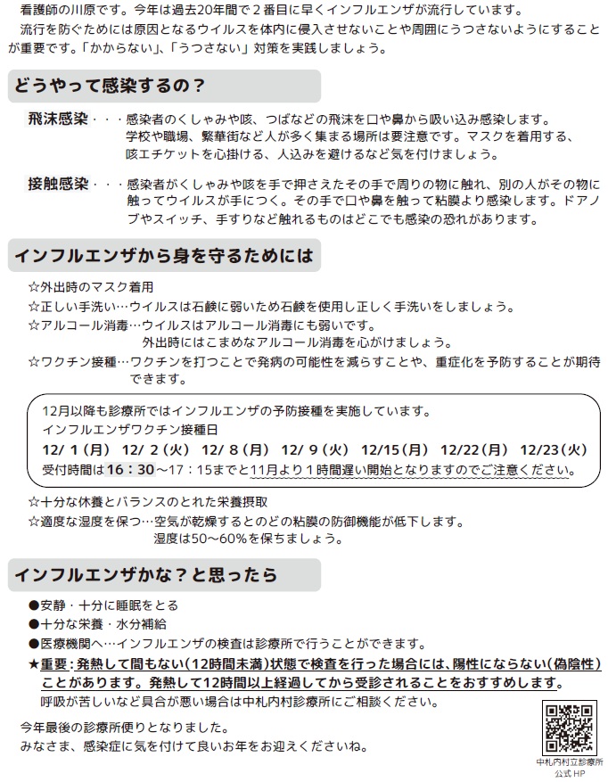 くらし 中札内村立診療所便(だよ)り(No.45) 12/29 前の記事 次の記事 発行日 : 2025年12月01日 自治体名 : 北海道中札内村 広報紙名 : 広報なかさつない 令和7年12月号 看護師 川原 真紀 ■インフルエンザ感染対策について お問い合わせ:中札内村立診療所 〒089-1332 中札内村西2条南3丁目23 【電話】67-2012 Tweet シェアする 令和七年度 商工永年勤続優良従業員表彰 図書館だより