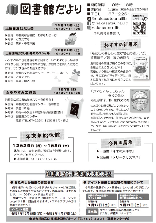 くらし 図書館だより 13/29 前の記事 次の記事 発行日 : 2025年12月01日 自治体名 : 北海道中札内村 広報紙名 : 広報なかさつない 令和7年12月号 Tweet シェアする 中札内村立診療所便(だよ)り(No.45) カメラルポ