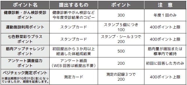 歩数ポイントやデータ送信ポイントなどの獲得は、令和8年1月17日(土)が期限です。また、未送信のデータや提出物が必要なポイントの締め切りは令和8年1月31日(土)となっていますので、お忘れのないようにお願いします。提出は保健センター、またはサツドラ中札内店の提出BOXまでお願いします。