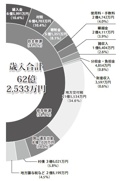 歳入総額は前年度に比べると3億228万円減の62億2,533万円です。歳入では、寄附金のうち、ふるさと納税が前年度から2億5,440万円の減となり、経費などを差し引いた2億2,960万円が、村の事業に使える財源となります。
