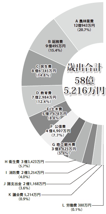 歳出総額は、前年度比2億8,428万円減の58億5,216万円となりました。内訳では、「総務費」が前年度比3億1,040万円の減、「商工観光費」は2億6,625万円の減となりました。主な要因は、ふるさと納税の返礼品などの経費、まちなかキッチンスタジオ建設などの工事費の減によるものです。