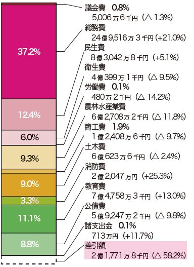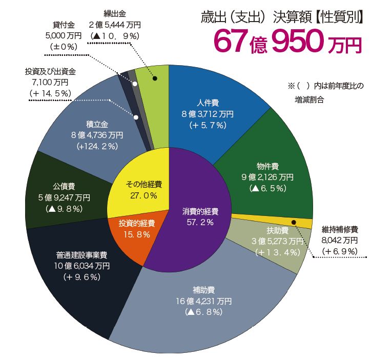 歳出総額は67億950万9千円で、前年度比3億8309万7千円、6.1%の増となりました。