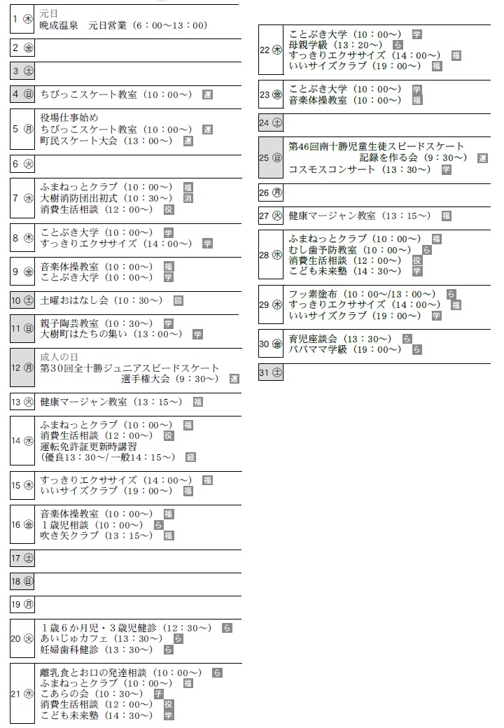 くらし 1月 カレンダー 34/37 前の記事 次の記事 発行日 : 2025年12月25日 自治体名 : 北海道大樹町 広報紙名 : 広報たいき 令和8年1月号 No.693 役…役場 学…生涯学習センター 図…図書館 ら…らいふ 経…経済センター 福…福祉センター 子…子育て支援センター 消…大樹消防署 運…中央運動公園スケートリンク場 Tweet シェアする 町立病院 1月の夜間・専門外来診療 友好都市 吉岡町からのお便り