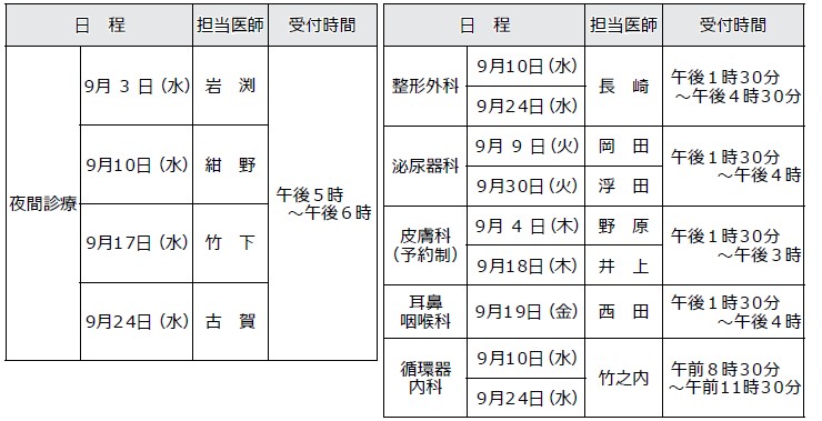 くらし 町立病院 9月の夜間・専門外来診療 28/32 前の記事 次の記事 発行日 : 2025年08月28日 自治体名 : 北海道大樹町 広報紙名 : 広報たいき 令和7年9月号 No.689 町立病院では、常勤医師による夜間診療のほか、外部医師による専門外来を開設しています。 お問い合わせ:町立病院 事務局 【電話】6-3111 Tweet シェアする 国勢調査 2025 9月 カレンダー