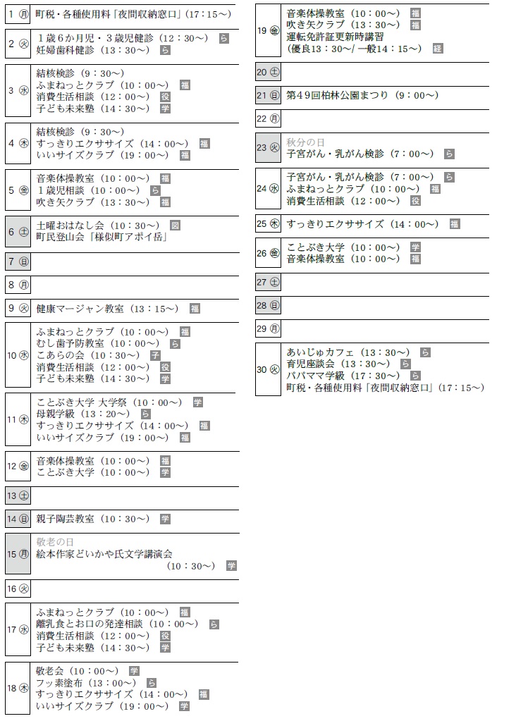 くらし 9月 カレンダー 29/32 前の記事 次の記事 発行日 : 2025年08月28日 自治体名 : 北海道大樹町 広報紙名 : 広報たいき 令和7年9月号 No.689 役…役場 学…生涯学習センター 図…図書館 ら…らいふ 経…経済センター 福…福祉センター 子…子育て支援センター Tweet シェアする 町立病院 9月の夜間・専門外来診療 友好都市 吉岡町からのお便り