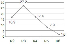 標準財政規模(自治体の一般財源の標準的な大きさ)に占める一般会計が負担する町債償還額などの割合で、令和6年度決算では、前年度から0.5ポイント増の10.0%となりましたが、早期健全化基準を下回っているので良好と言えます。