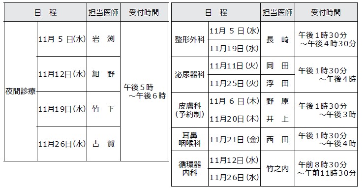 くらし 町立病院 11月の夜間・専門外来診療 34/38 前の記事 次の記事 発行日 : 2025年10月22日 自治体名 : 北海道大樹町 広報紙名 : 広報たいき 令和7年11月号 No.691 町立病院では、常勤医師による夜間診療のほか、外部医師による専門外来を開設しています。 お問い合わせ:町立病院 事務局 【電話】6-3111 Tweet シェアする 自衛官の募集 11月 カレンダー