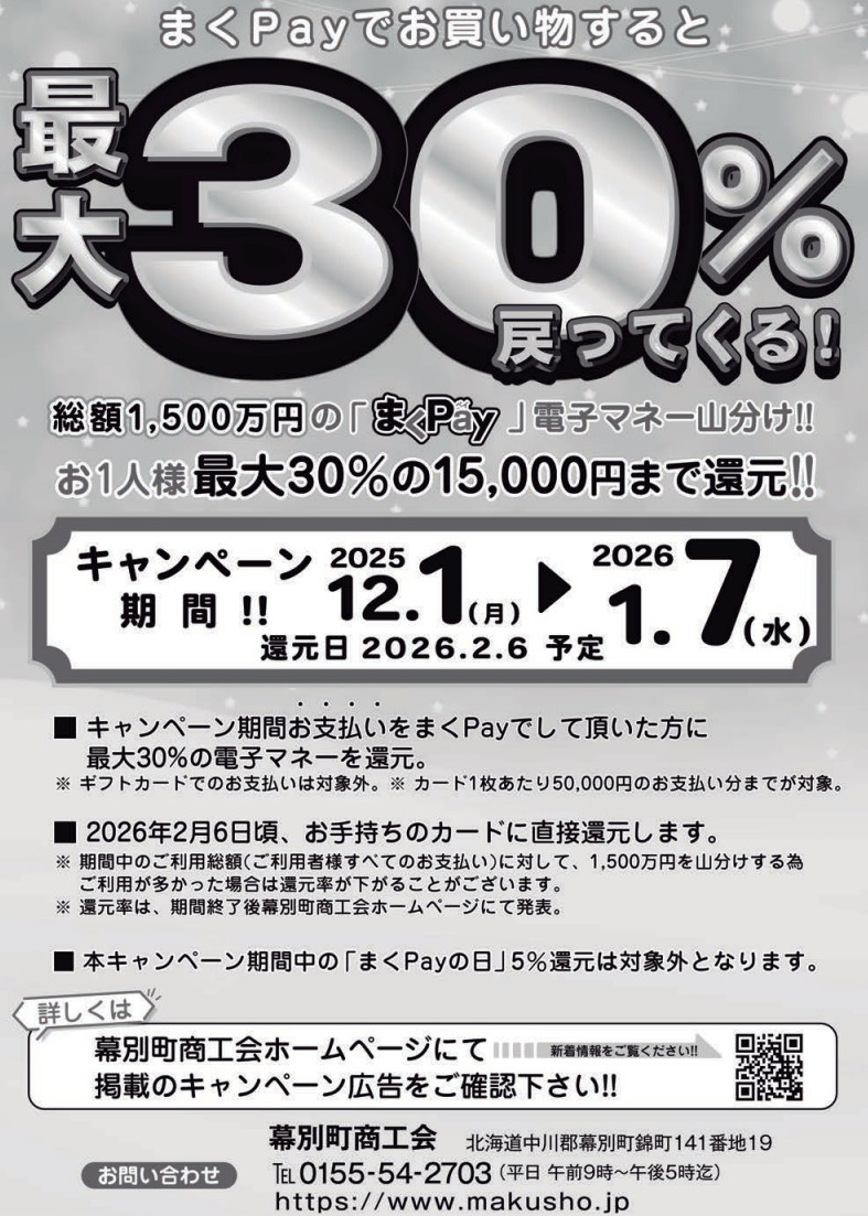 くらし 幕別町電子地域通貨 まくPay祭り ~2025冬~ 17/41 前の記事 次の記事 発行日 : 2025年12月01日 自治体名 : 北海道幕別町 広報紙名 : 広報まくべつ 令和7年12月号 Tweet シェアする とかち年末大売出し2025 まちのわだい