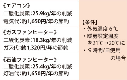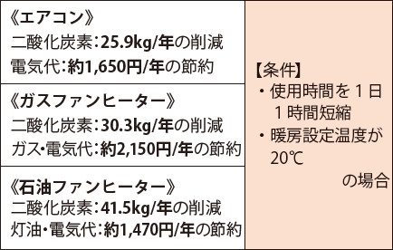 ・設定温度を高くし過ぎず、使用時間を短くすると省エネ効果大