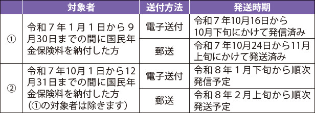 日本年金機構から次のスケジュールで「社会保険料(国民年金保険料)控除証明書」が発送されますので、手元に届きましたら大切に保管し、年末調整や確定申告の際に使用してください。