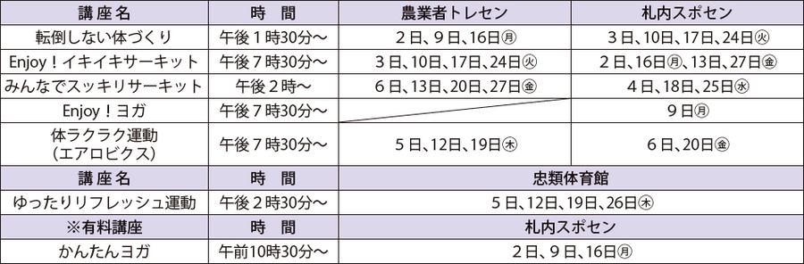 内容:背骨などのゆがみを整え、気になる部位の引き締め運動や代謝を上げる簡単な筋力トレーニングなど