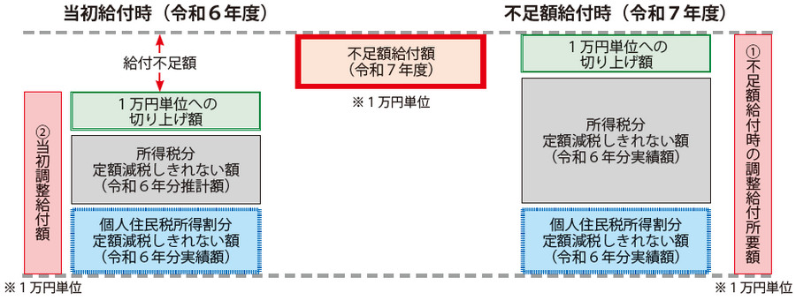 令和6年度に令和6年分推計所得税額と令和6年度個人住民税所得割額を基に定額減税が実施され、その際に定額減税しきれないと見込まれる方には、その額を1万円単位に切り上げて算定した「定額減税調整給付金(当初調整給付金)」を支給しましたが、税額が確定したことで支給した給付金に不足が生じる場合は、追加で「定額減税調整給付金(不足額給付分)」を支給しています。