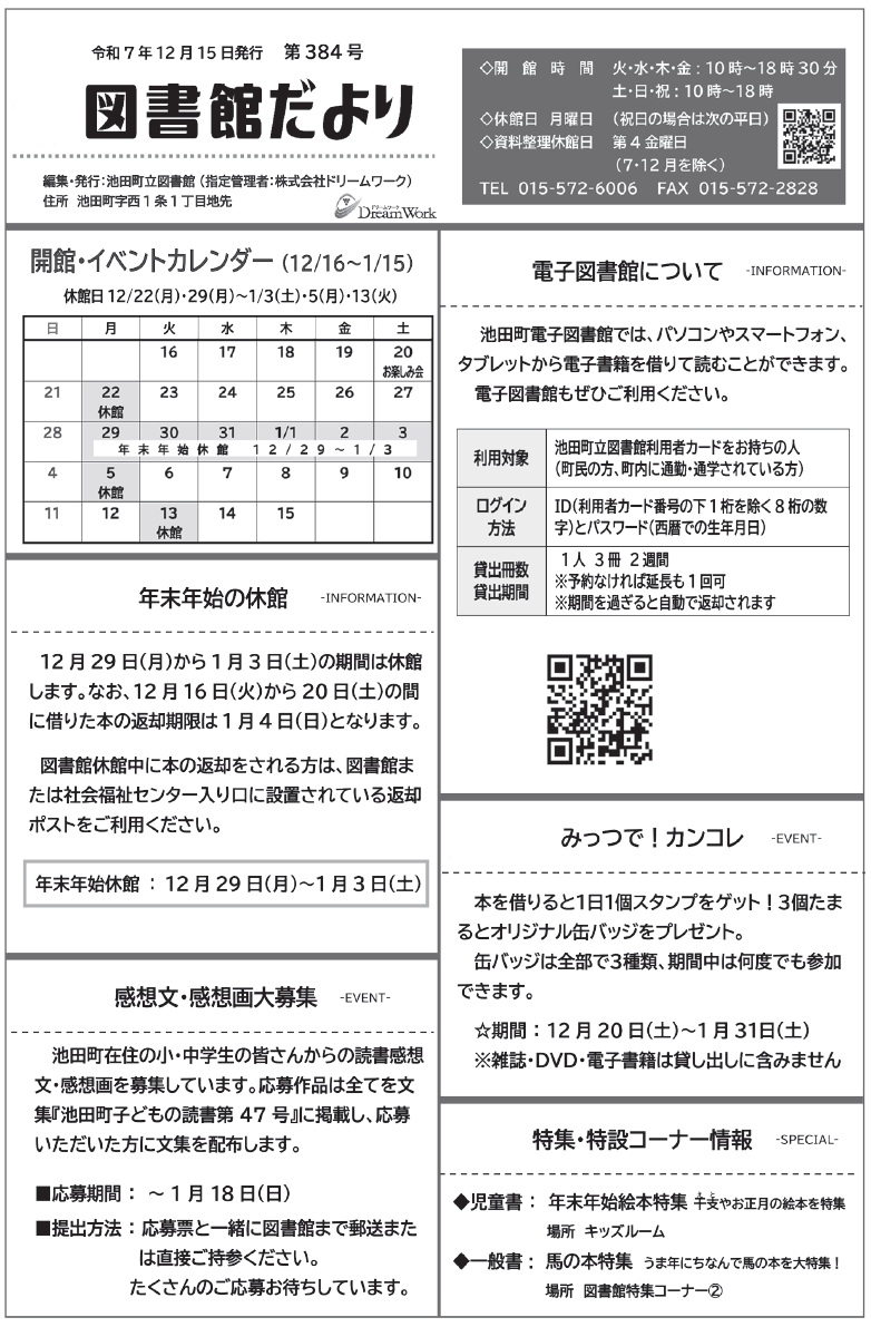 文化 図書館だより 11/20 前の記事 次の記事 発行日 : 2025年12月15日 自治体名 : 北海道池田町 広報紙名 : 広報いけだ 2025年12月号 Tweet シェアする 町長日誌 暮らしの情報 DECEMBER 2025(1)
