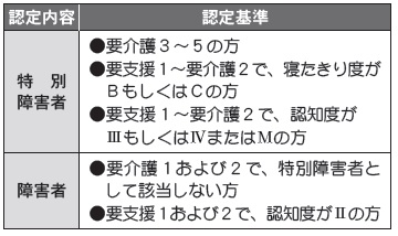 身体障害者手帳などの交付を受けていない方でも、満65歳以上で介護認定を受け、下記の認定基準を満たしている方や、6カ月以上寝たきり状態で複雑な介護を要する方は、障害者に準ずる者として所得税・町道民税の障害者控除の対象になります。