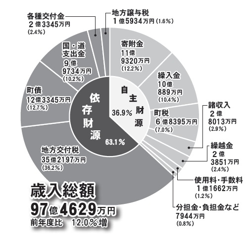 歳入総額は、前年度より10億4342万円増加しました。地方交付税は、普通交付税31億5074万円と特別交付税3億7123万円を合わせて35億2197万円となり、前年度より1113万円増加しました。