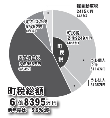・町民税(個人・法人):収入のある町民の皆さんが納める税金と、町内に事務所などのある会社や団体などが納める税金