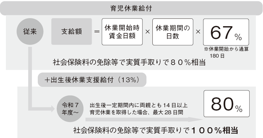 「出生後休業支援給付」を創設し、子の出生直後の一定期間内に両親ともに14日以上の育児休業を取った場合、最大28日間、手取りの10割相当を支給します。