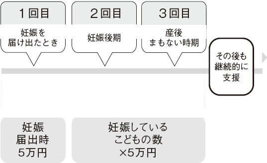 ・妊娠後期以降に妊娠しているこどもの数×5万円を支給します。